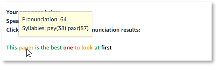 You can click on any word to see a breakdown of how you pronounced each syllable aiding your learning. In the example below, it highlights areas to improve, such as the first syllable of the word ‘paper’.